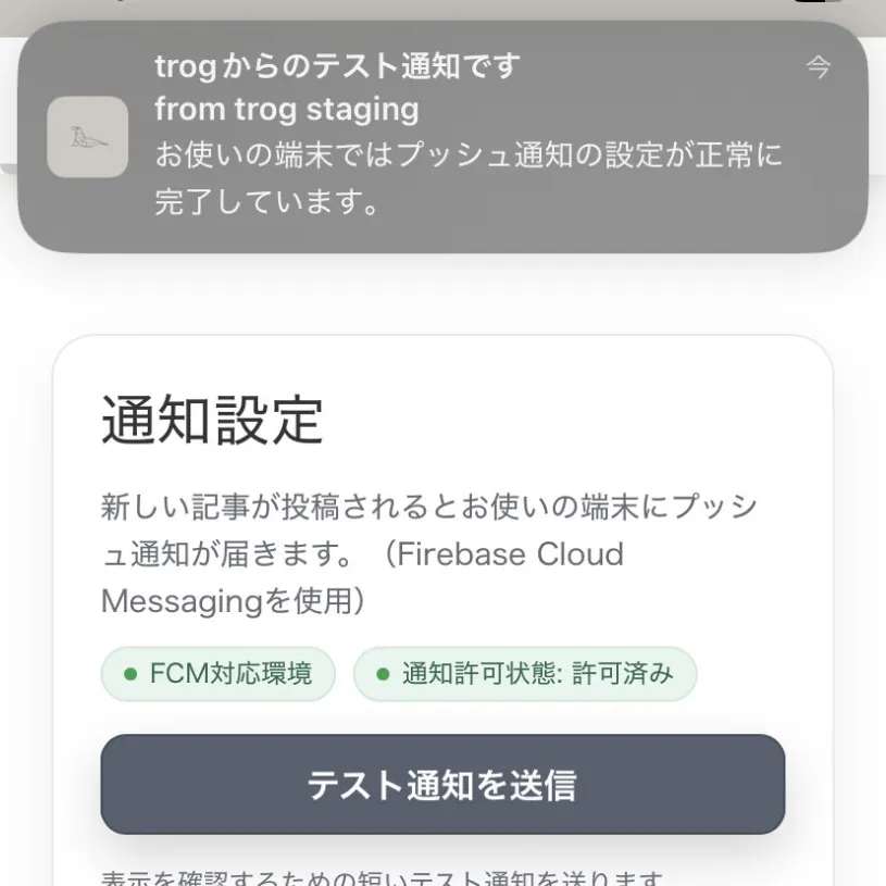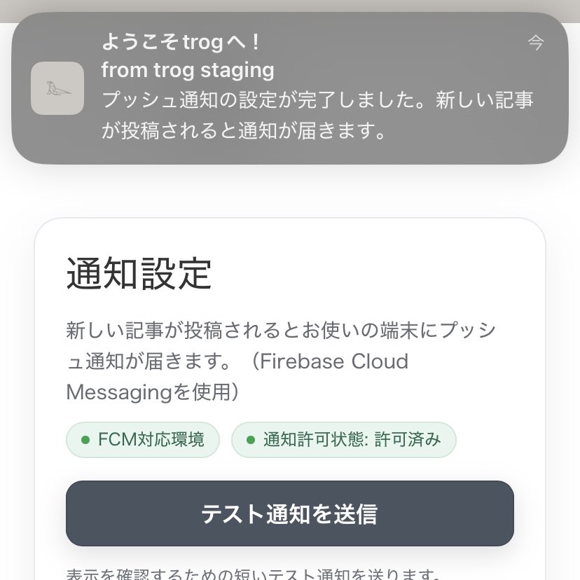 - PCブラウザのtrog通知権限をリセット(スマホはtrog PWAアプリを削除後、再インストール)後、あらためて通知を許可する