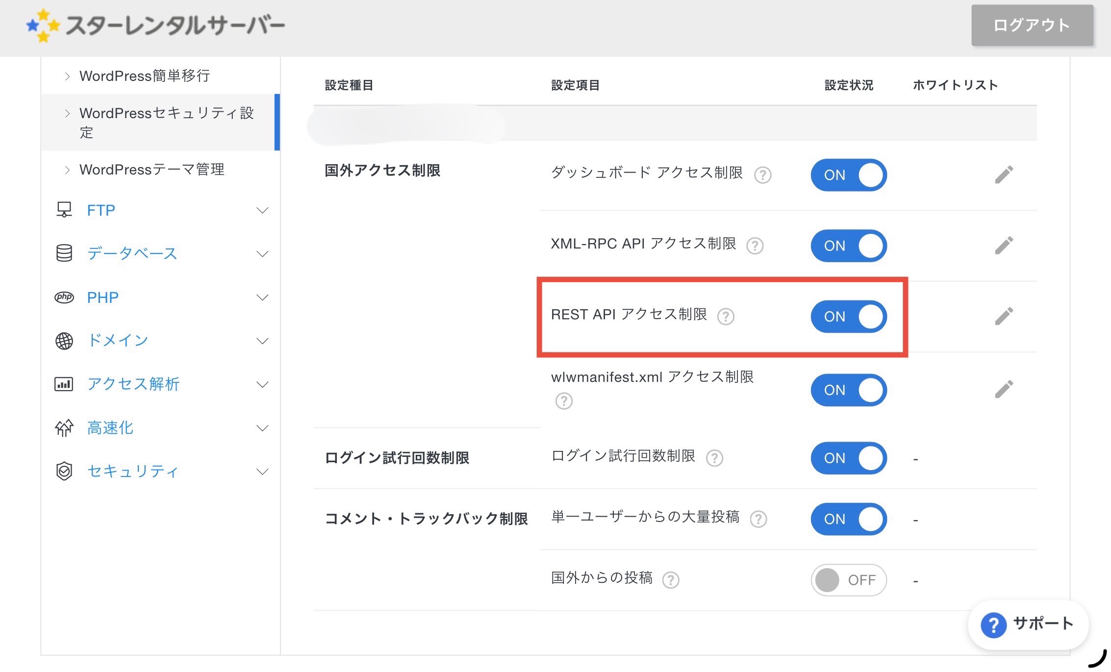 実際に確認してみると、スターサーバーの WordPress セキュリティ設定で、REST API に対する国外アクセス制限が有効になっていました。