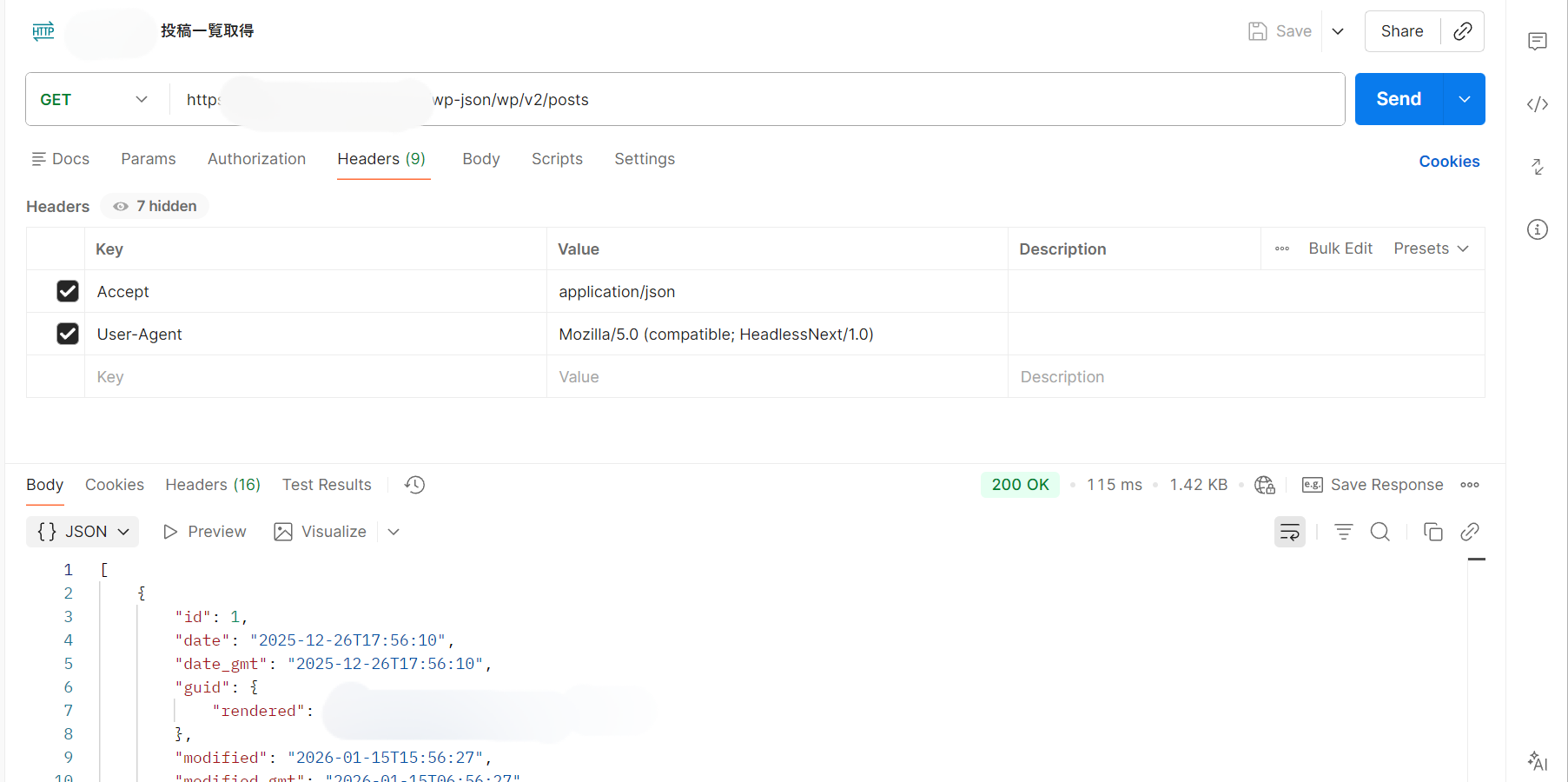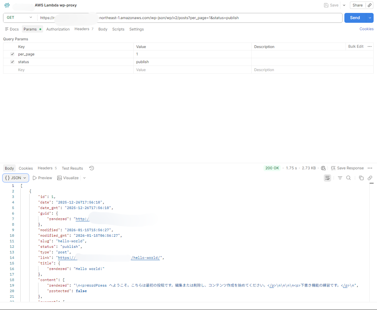 設定後は、まず API Gateway 側の URL に対してリクエストし、WordPress の投稿 JSON が返ることを確認しました。