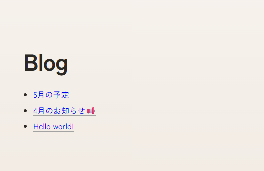 }一覧ページ /blog では、取得した記事をタイトル付きのリンクとして並べています。