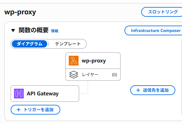 ここでレスポンスが返ってきたので、API Gateway → Lambda → WordPress の経路が通っていることがわかります。