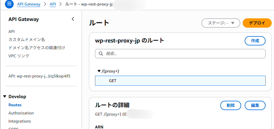 };入口となる API Gateway 側では、GET /{proxy+} のルートを作成し、その統合先としてこの Lambda 関数を設定しました。