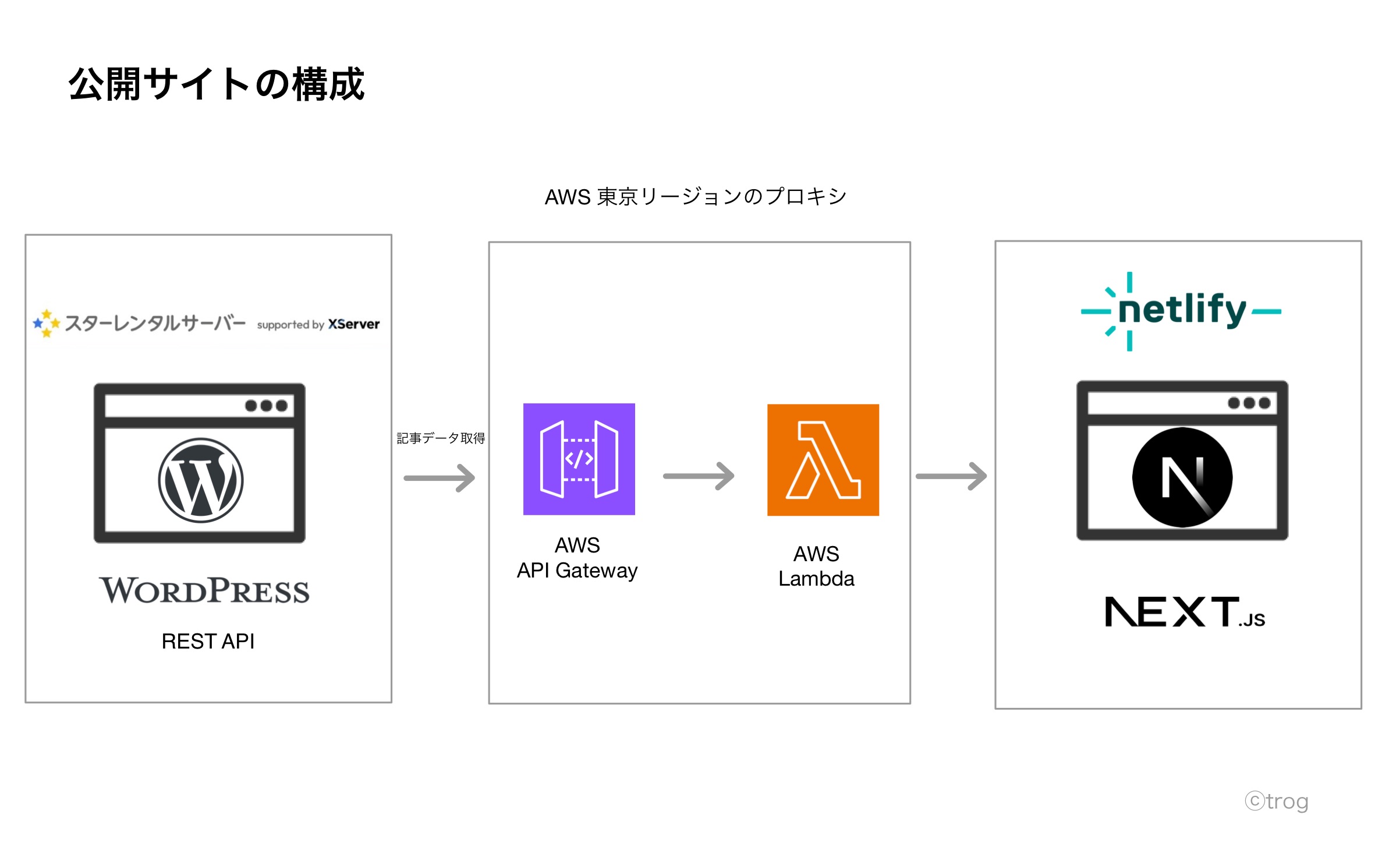 最終的には、AWSのAPI GatewayとLambdaを挟むことで、WordPress側のサーバー設定やセキュリティ対策をそのまま活かしつつ、Netlify上のNext.jsから記事を取得できるようにしています。